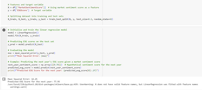 print(f"Predicted ESG Score for the next year: {predicted_esg_score[0]:.2f}")The output would be: